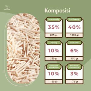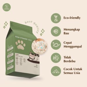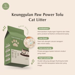 Paw Power Tofu Cat Litter memiliki komposisi utama yang berasal dari bahan alami, yaitu serat kedelai dan pati jagung, sehingga mudah larut dalam air dan dapat dibuang dengan flushing ke toilet tanpa khawatir akan adanya penyumbatan pada saluran air. Terlebih lagi, Kandungan antiseptik dan antibakteri di dalamnya menciptakan lingkungan rumah dan kotak pasir anabul menjadi lebih higienis, sehingga Pawparents dapat merasa lebih tenang