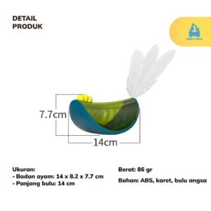 Mainan ini terbuat dari material berbahan ABS Food Grade berkualitas pilihan yang sudah tersertifikasi, sehingga sangat aman digunakan. Pada bagian kepala ayam terbuat dari material karet yang lembut dan tidak mudah rusak. Mainan ini juga telah dilengkapi dengan bulu dan lonceng yang dapat berbunyi untuk menarik perhatian anabul.